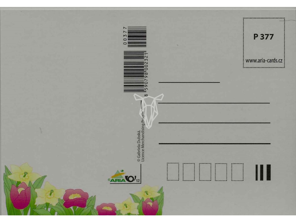 Maková panenka a motýl Emanuel se pokoušejí zachránit žalud před loupežníčkem Buráskem, výjev se odehrává na žlutozeleném pozadí. Zadní strana pohledu bílá, na dolním okraji barevný obrázek narcisů a tulipánů.