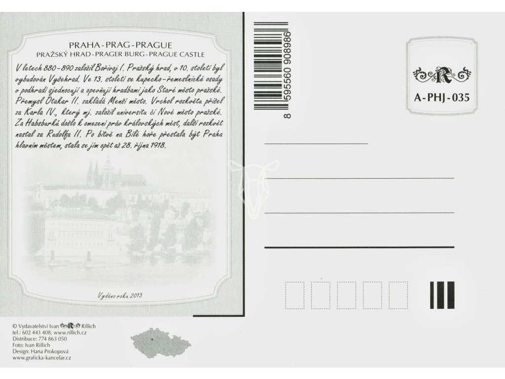 Pohled přes řeku Vltavu na Staré Město, korunovaný siluetou Hradčan. Na zadní straně stručná historie Pražského hradu. Foto: Ivan Rillich