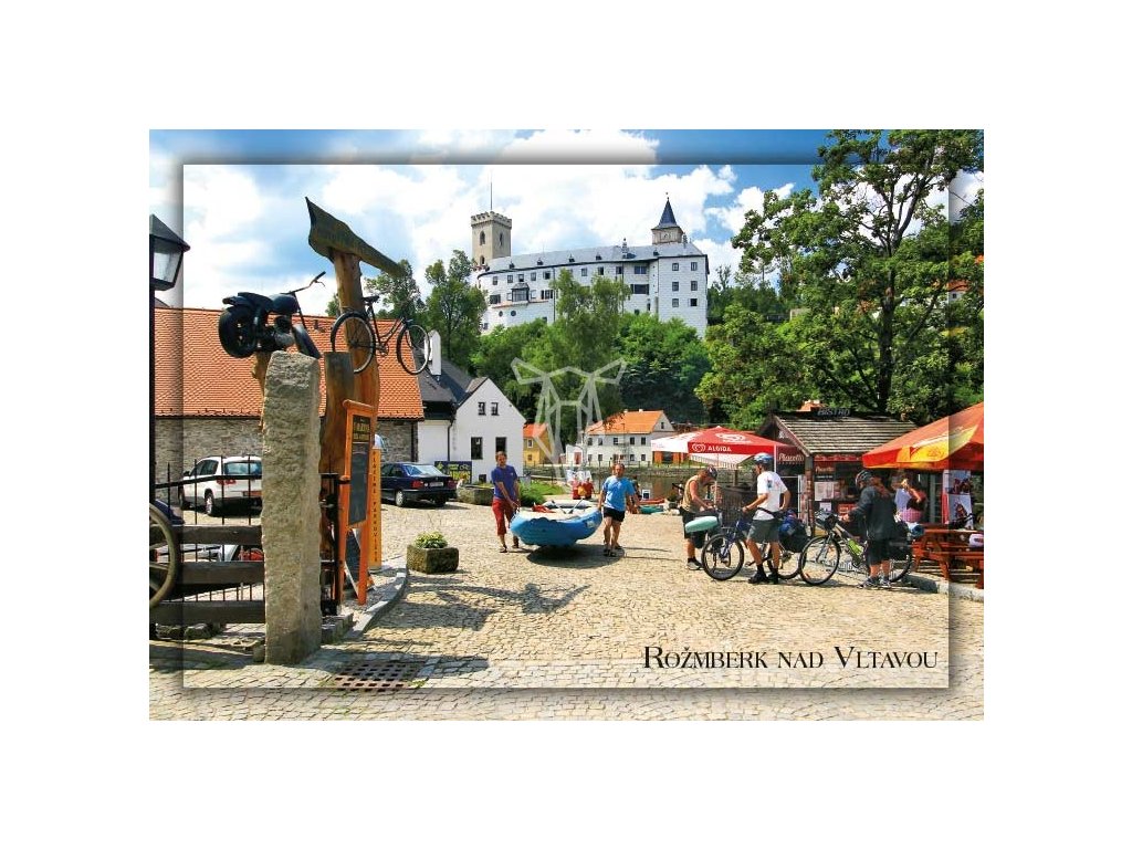 Pohled na možnosti aktivního odpočinku v Rožmberku nad Vltavou v přímém přenosu - na kole nebo lodí? Obojí je skvělá volba. V pozadí se tyčí hrad, na zadní straně pohledu pak stručná historie hradu. Foto: Ivan Rillich