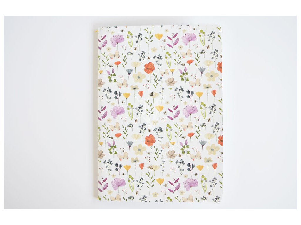 Sešit s motivem včel a čmeláků na louce plné květů.