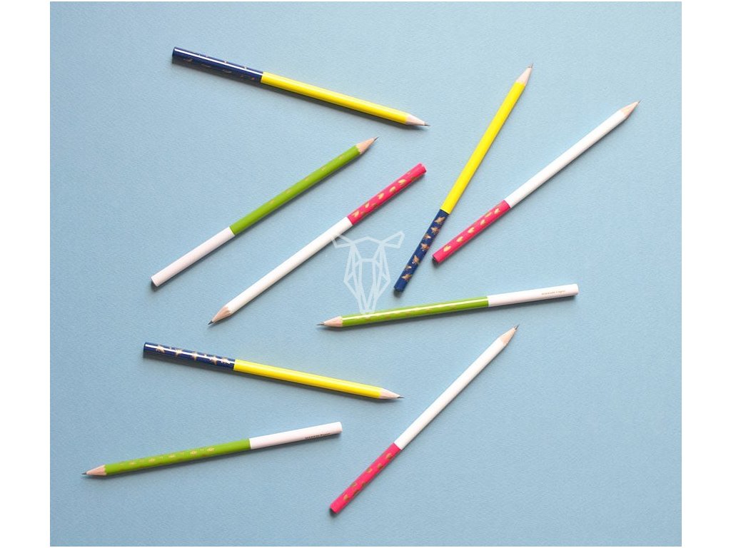 Lakovaná česká tužka s bílým vrškem a fuchsiově růžovým spodkem potištěným zlatými srdíčky.