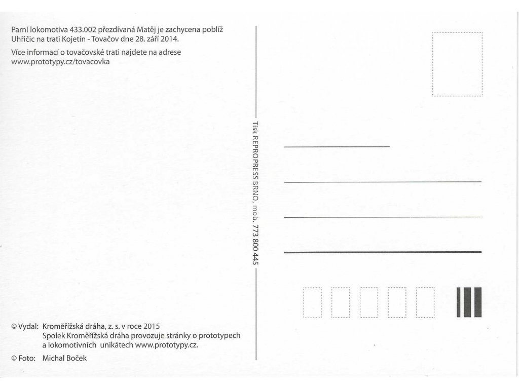 Parní lokomotiva 433.002 (Matěj) na dráze Kojetín - Tovačov. Matěj byl vyroben roku 1948, 30 dalších let pak sloužil na dráze v pravidelném provozu. Od roku 2018 je Matěj uložen v Chomutově v depozitáři Národního technického muzea, protože jeho kotli vypršela zákonná způsobilost, opravy, které jsou potřebné k tomu, aby lokomotiva opět mohla brázdit trať, jsou velice nákladné, nicméně milovníci okřídleného kola doufají, že se jim časem povede vybrat dostatek peněz a Matěj znovu vyrazí. Možná Vás napadlo, jak tato lokomotiva přišla ke svému jménu - jedním z mnoha lidí, kteří se zasloužili o její renovaci a znovuzprovoznění, byl Josef Matiovský, kterému se neřeklo jinak než Matěj, a aniž by se pan Matiovský o něco takového pokoušel, jméno se ujalo i pro "jeho" lokomotivu. Foto: Michal Boček