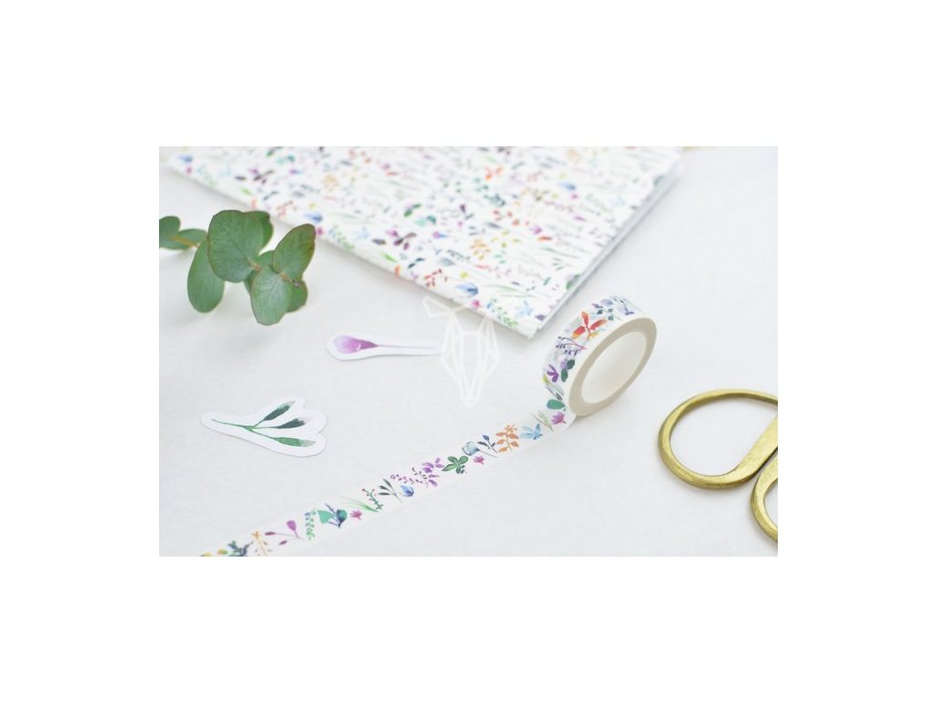 Washi páska s autorským akvarelem s kvítím snad všech barev spektra, pohromadě v oku lahodícím barevném výbuchu.